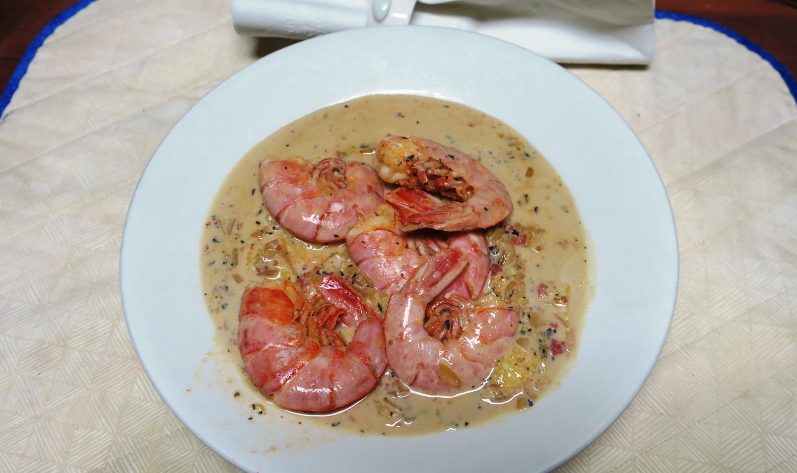 The Shrimp and Grits sack, produced by Gullah Gourmet, contains packages of grits and sauce base. Adding water to each (separately) and cooking for the specified time yields a pot of cornmeal mush and some very tasty sauce. A pound of shrimp, sauteed in butter as the package instructions recommend, completes the dish. It’s rich, filling and delicious, and serves four. For fourteen dollars, it’s an affordable indulgence. Include a salad for a complete meal.
